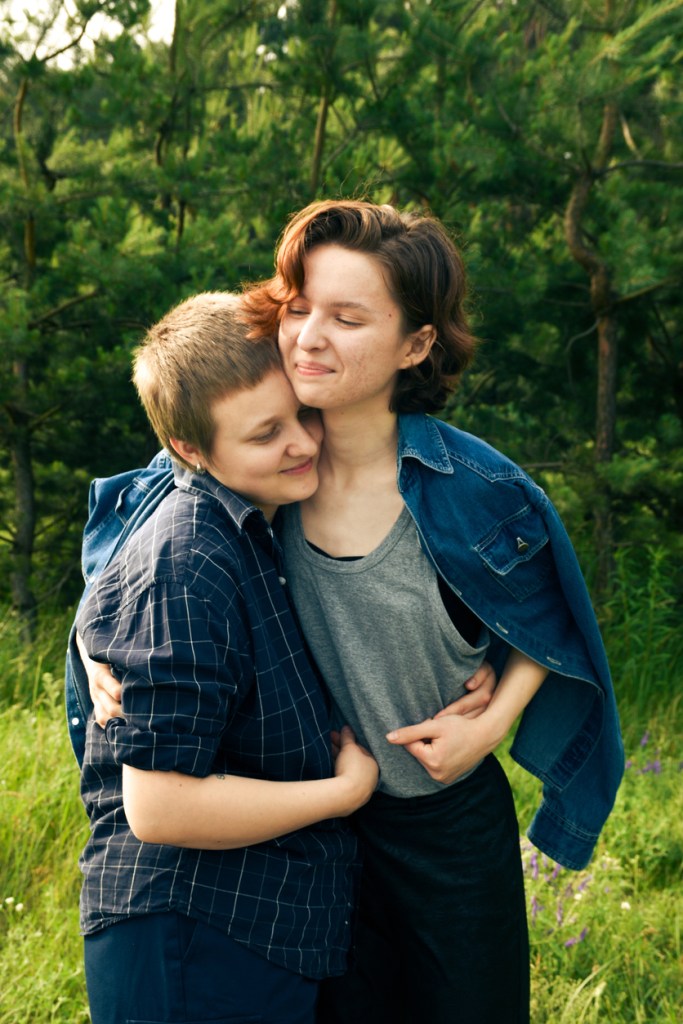 Happy young lesbian couple embracing outdoors; same sex family and relationship concept