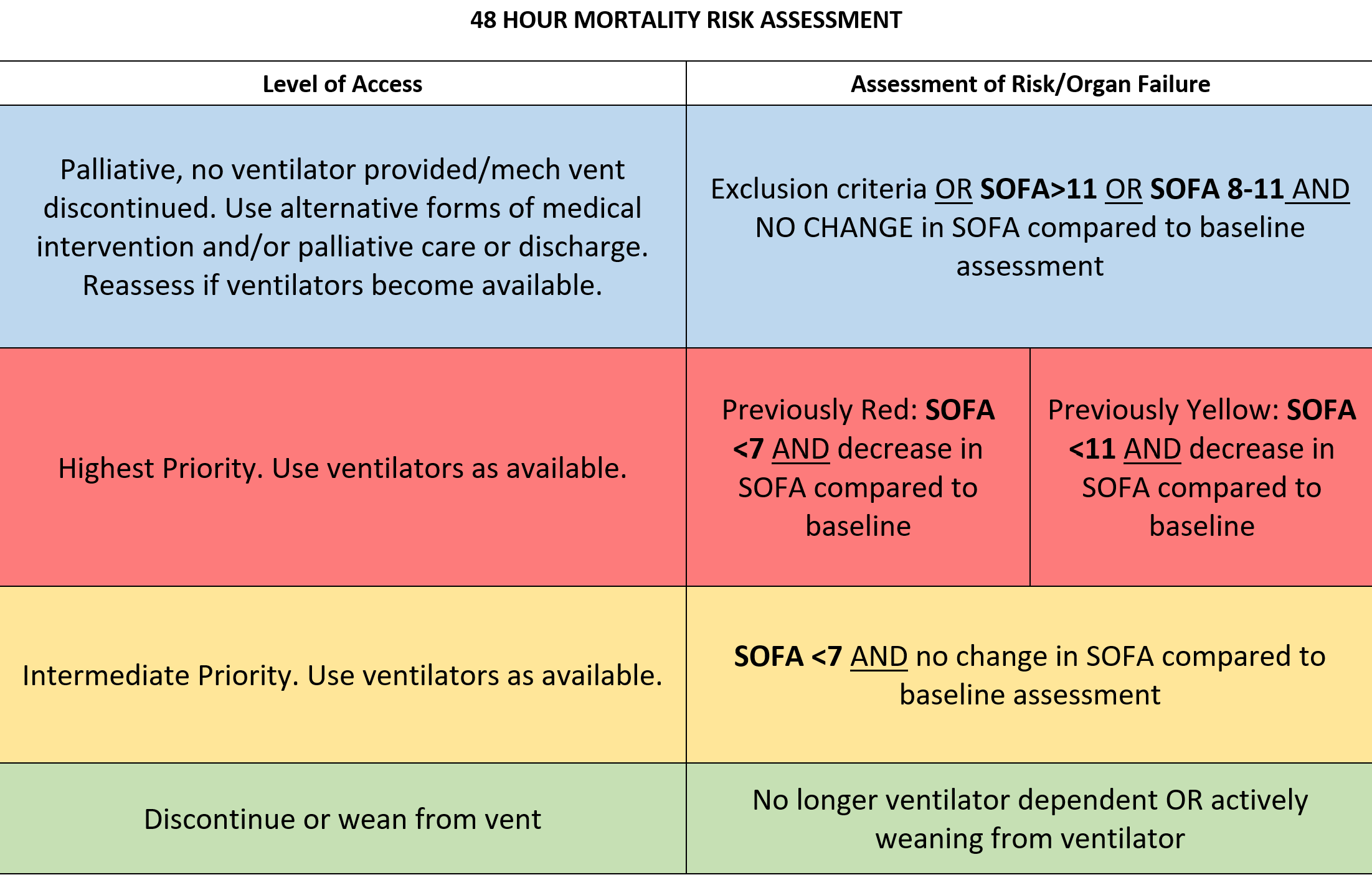 Beyond 120 hours: Any patient who is continued on mechanical ventilation at the 120 hour mortality risk assessment will be reevaluated every 48 hours by the triage committee using the SOFA criteria. The decision to continue mechanical ventilation at each assessment should be based on SOFA criteria with consideration of clinical improvement or deterioration, the underlying diagnosis and its known progression, current status of pandemic and available resources, and alternatives for care (treatment options, transfer to another facility).