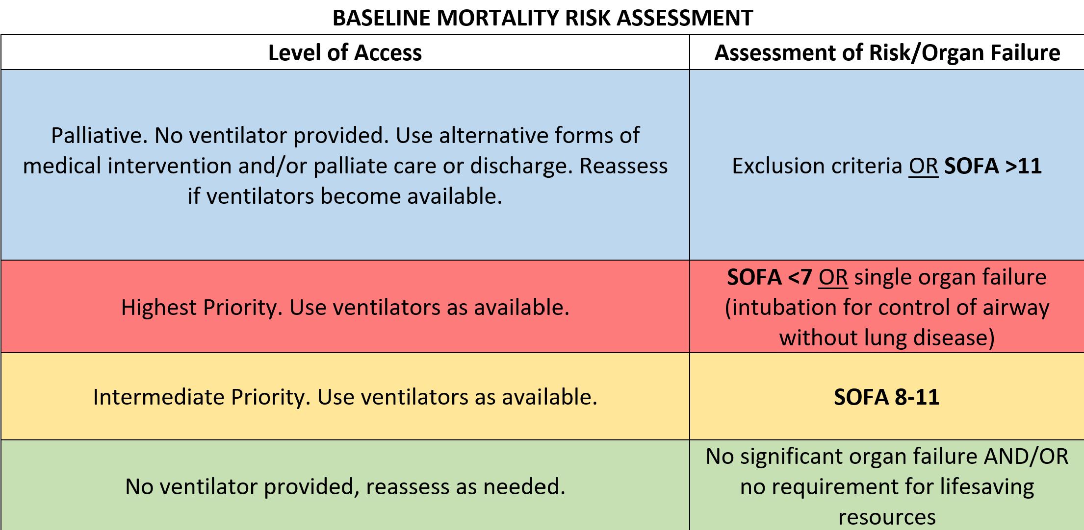 Baseline Assessment: Based on each patient’s initial mortality risk assessment, they will be categorized as follows. This baseline mortality risk assessment and the disposition of the patient (excluded from mechanical ventilation or initiation of a trial of mechanical ventilation implemented) will be recorded on a ventilator allocation flowsheet.