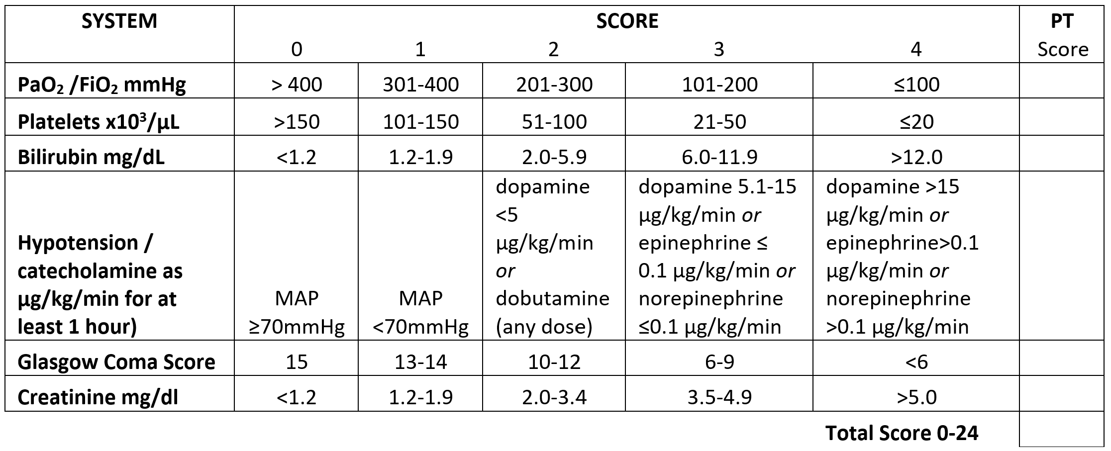 Mortality Risk Assessment: For patients who aren’t excluded based on the above criteria, a mortality risk assessment will be made using the Sequential Organ Failure Score (SOFA). (Ferreira 2001, p1754) This assessment is performed when the patient is initially triaged and again at 48 hours and 120 hours after the initial assessment.